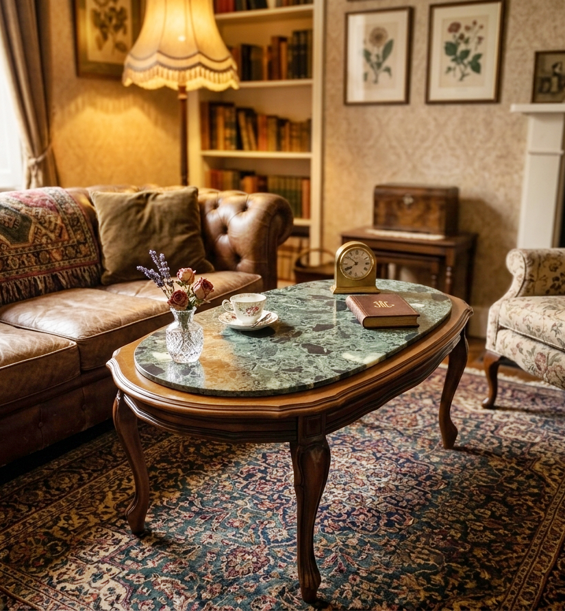 โต๊ะกลมพับครึ่งเป็นคอนโซลแต่งขอบและขาทองเหลือง